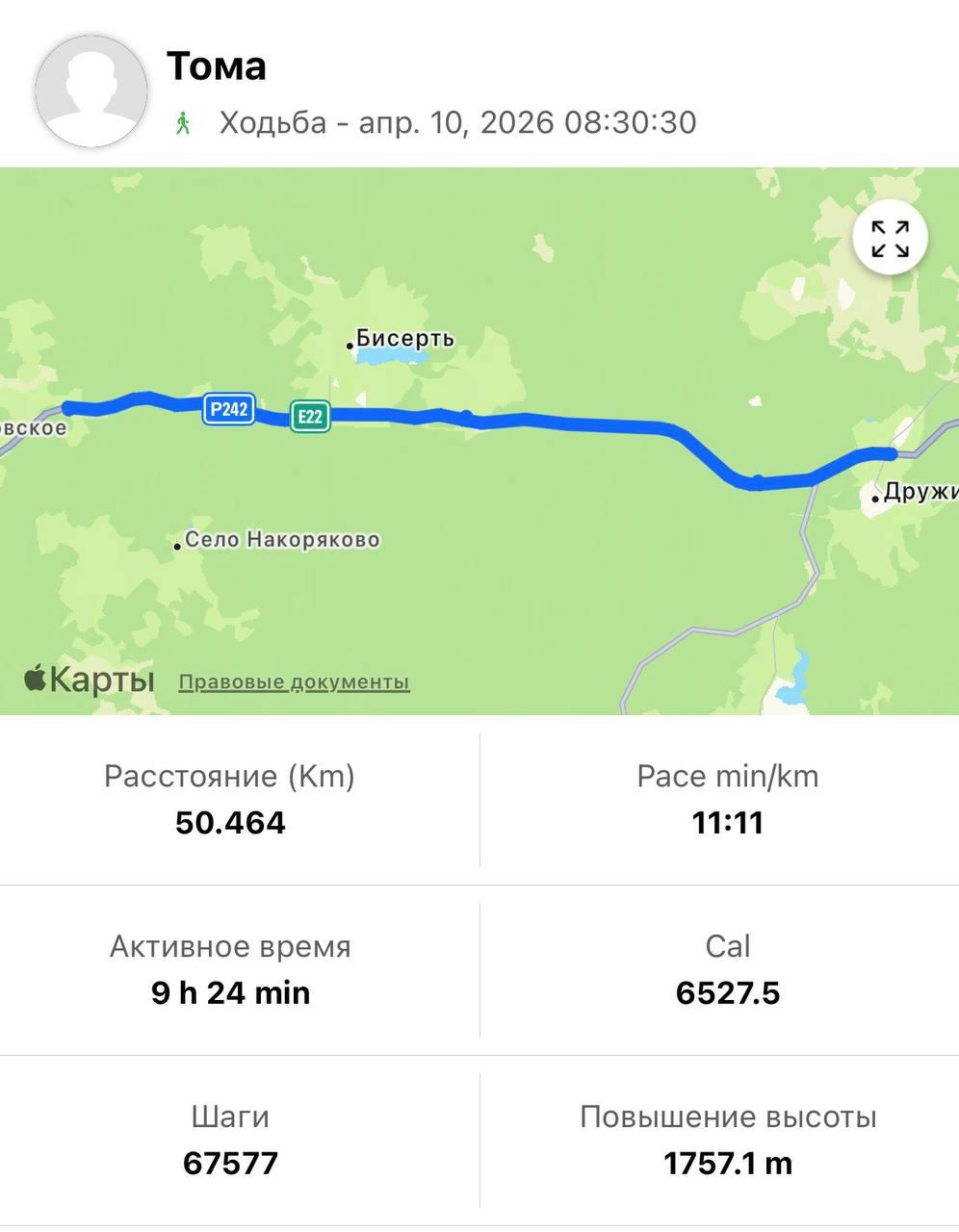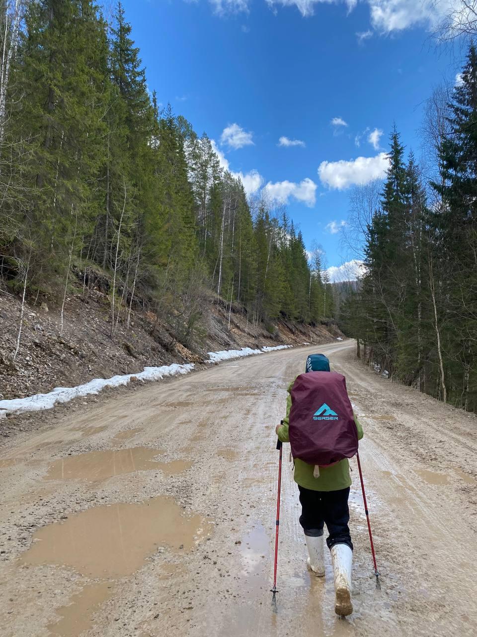 - 10 апреля: из-за закрытого отеля пришлось пройти больше запланированного — 50,46 км до села Дружинино. На еду ушло 1480 рублей.