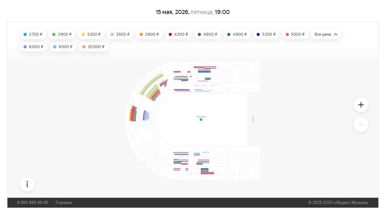 Билеты на концерт пользуются высоким спросом: уже проданы сотни мест, включая наиболее дорогие категории стоимостью до 20 тысяч рублей.