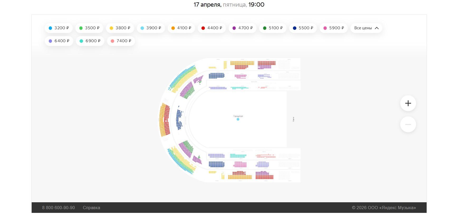 Выступление пройдёт на «Фетисов-Арене». Билеты уже активно продаются онлайн по цене от 3200 до 7400 рублей. Некоторые места, включая самые дорогие, уже куплены.