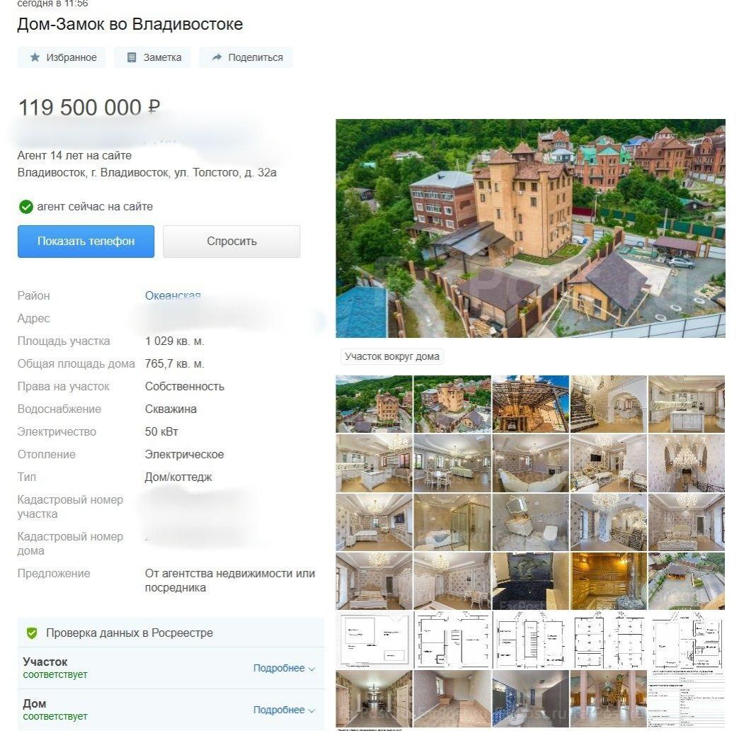 Владивостокский дом, стилизованный под замок и находящийся в районе Океанской, вновь появился в продаже. Четырехэтажная постройка размещена на участке в 10 соток и готова для постоянного проживания. Объявление о реализации объекта опубликовано на сайте FarPost.ru.