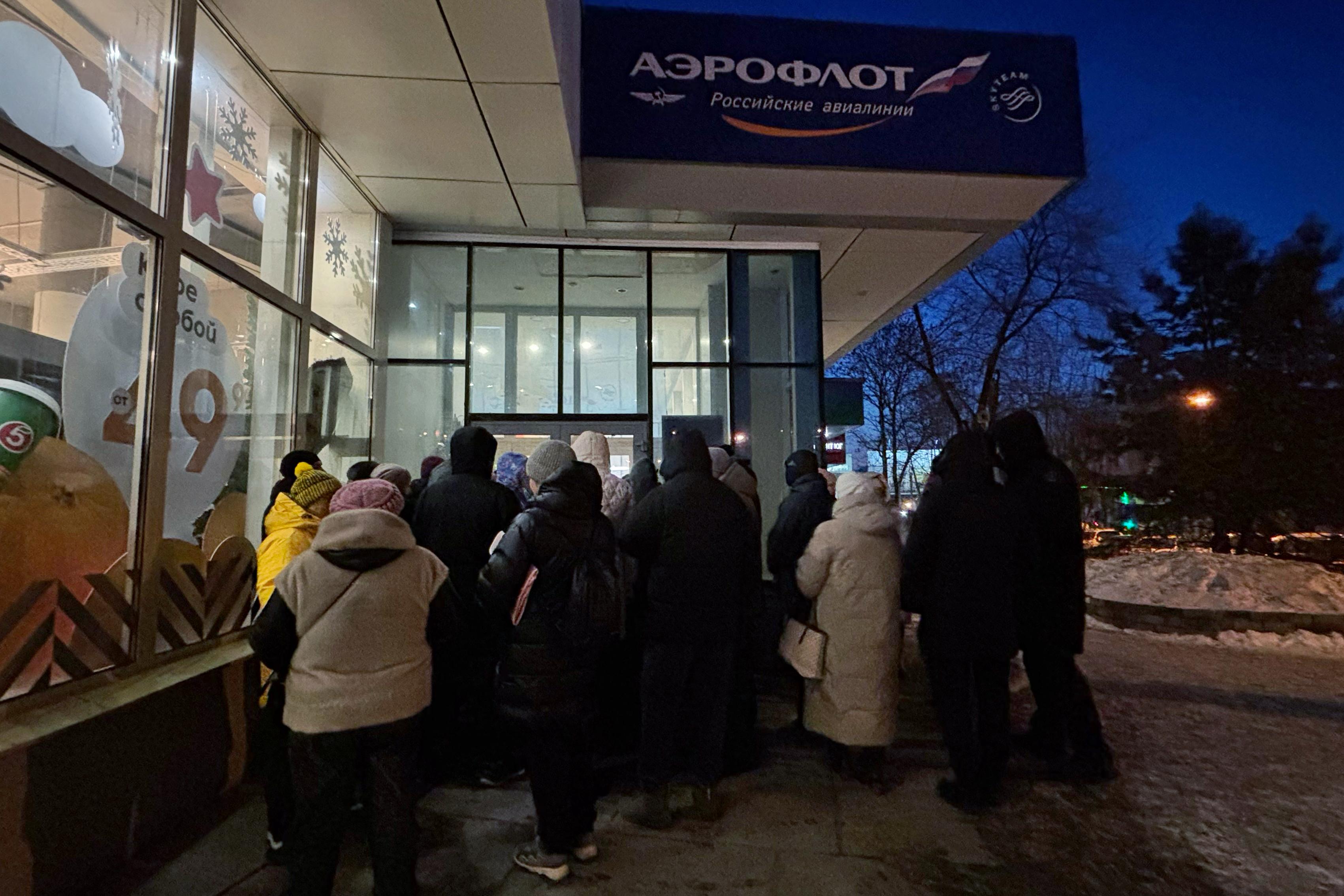 Мороз не останавливает людей, которые с раннего утра занимают очередь у офиса авиакомпании.