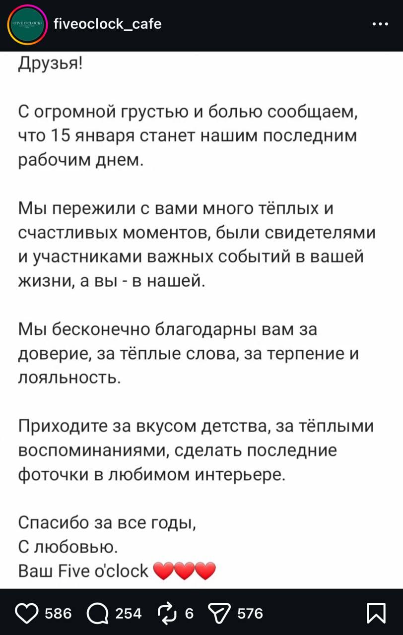 «С огромной грустью и болью сообщаем, что 15 января станет нашим последним рабочим днем. Приходите за вкусом детства, за теплыми воспоминаниями, сделать последние фоточки в любимом интерьере», — говорится в сообщении.