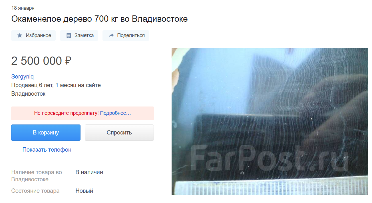 На торговой площадке Farpost во Владивостоке появилось объявление о продаже крупного куска окаменелого дерева. Его масса составляет от 500 до 700 килограммов, а стоимость лота — 2,5 миллиона рублей. Продавец отметил, что товар продается без возврата и осматривать его необходимо на месте.