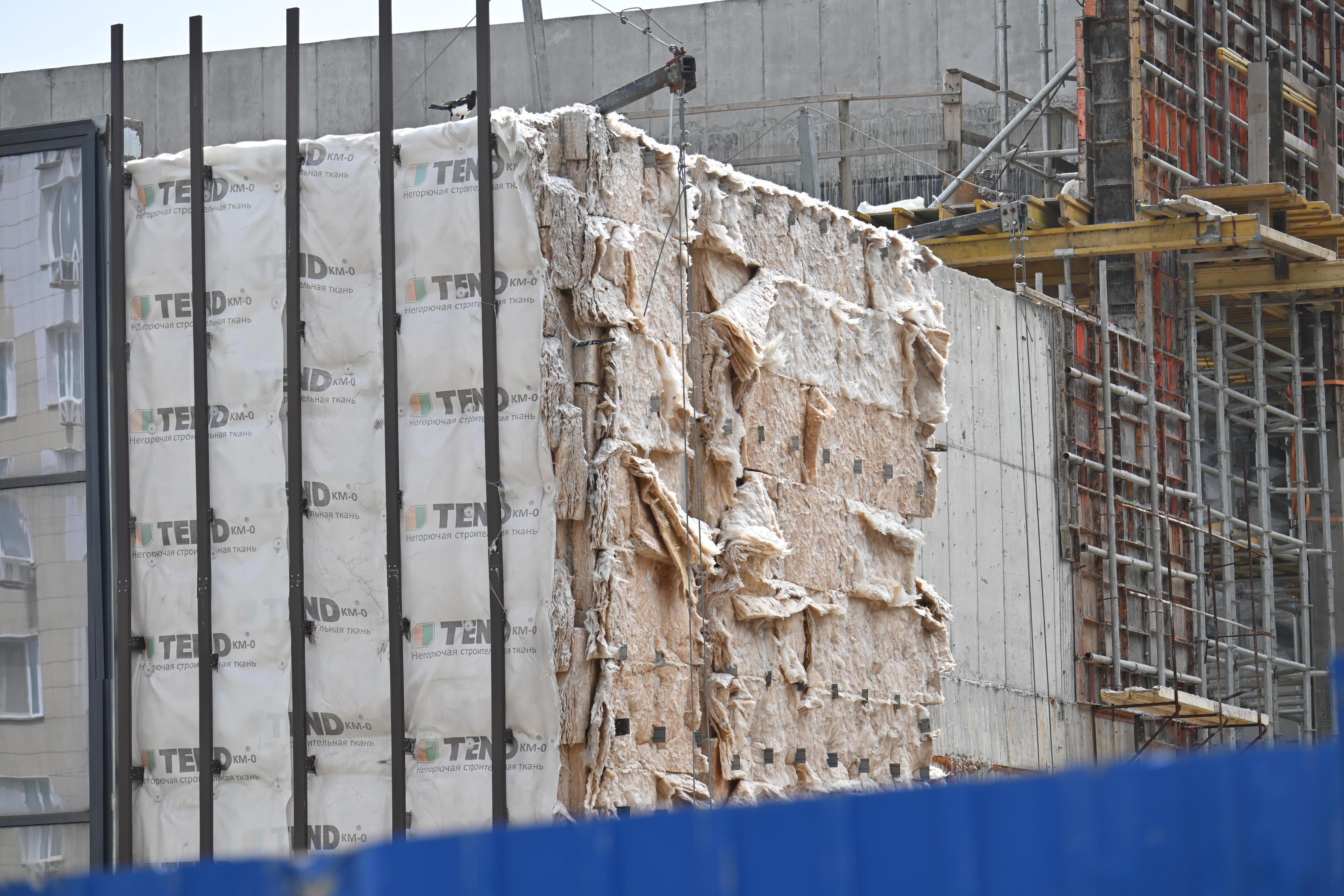 Внешний вид школы остался прежним: материалы лежали под открытым небом, оконные проемы были пусты, утеплитель поврежден. Забор частично обрушился и был залатан голубым щитом, а некоторые участки обжили сороки.