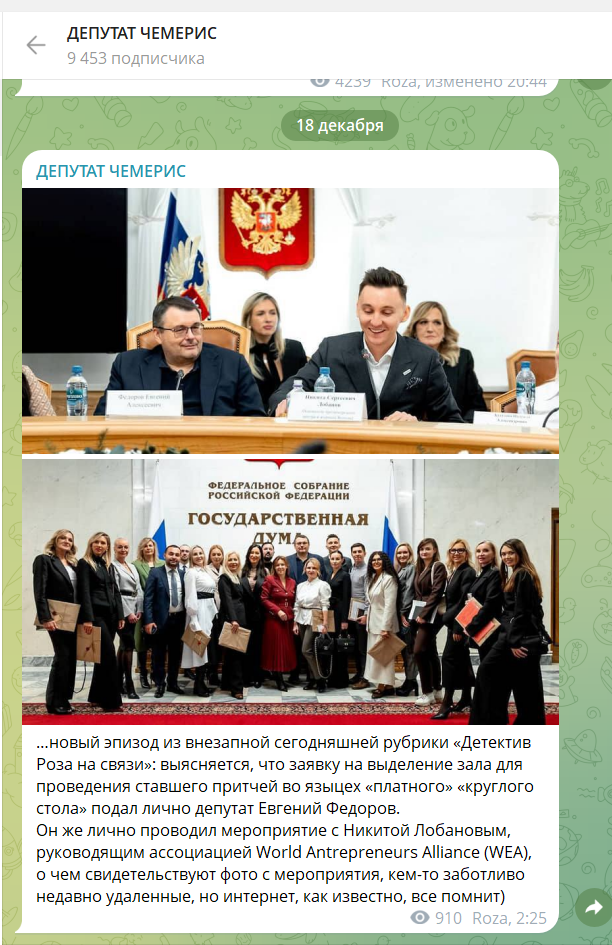 «Он же лично проводил мероприятие с Никитой Лобановым, руководящим ассоциацией World Entrepreneurs Alliance (WEA), о чем свидетельствуют фото с мероприятия, кем-то заботливо недавно удаленные, но интернет, как известно, все помнит», — добавила она в следующем посте.