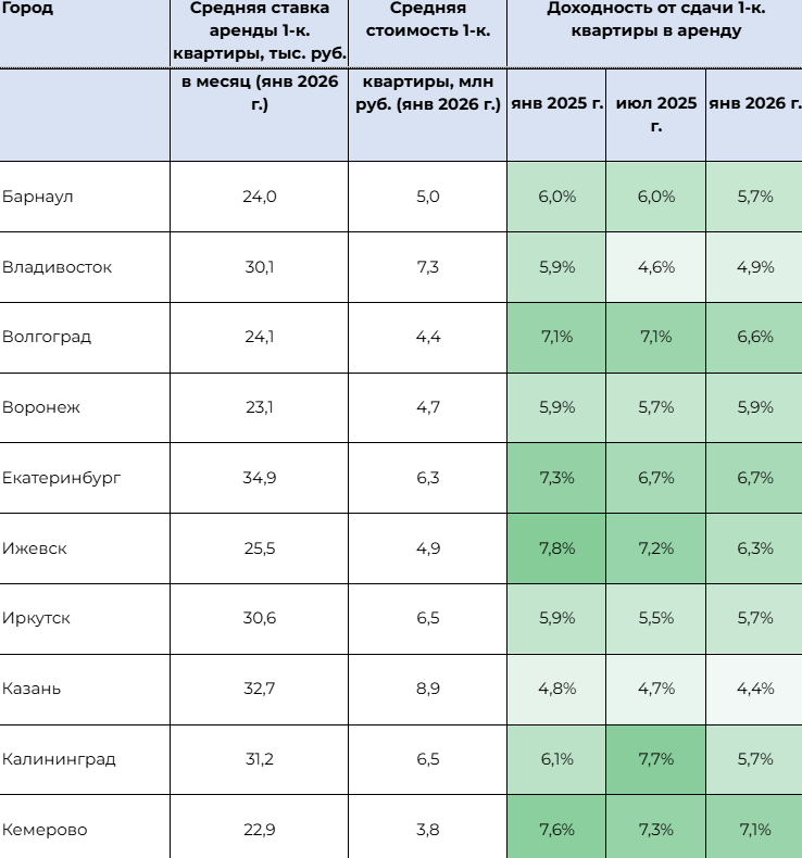 Среднероссийский уровень доходности от аренды в январе 2026 года составил 6,1%. Наивысшие показатели зафиксированы в Хабаровске, Ярославле, Кемерове, Новосибирске, а также в Московской и Ленинградской областях. За год доходность снизилась на 0,5%. Хотя арендная доходность по-прежнему отстаёт от банковского депозита, разрыв между ними сократился из-за снижения ключевой ставки ЦБ.