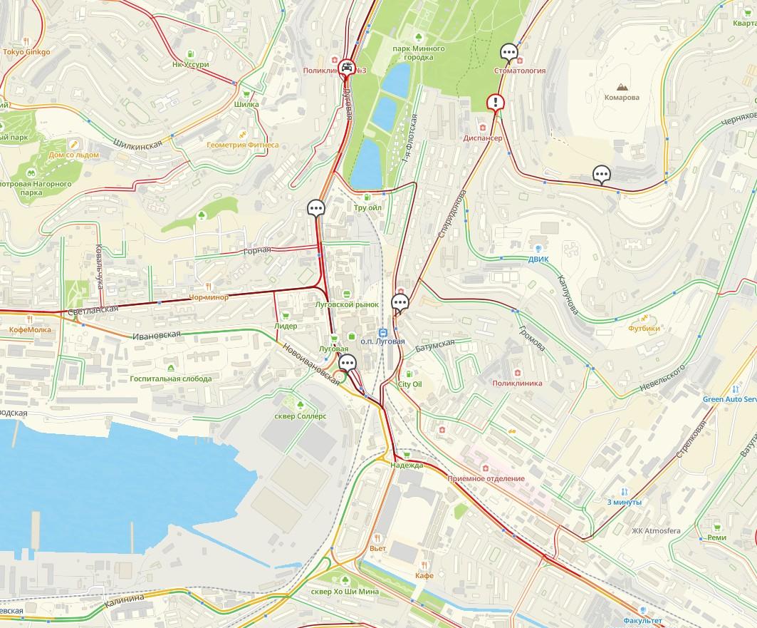 Наиболее сложная ситуация наблюдается на площади Луговой, а также на прилегающих улицах — Фадеева, Светланской и Спиридонова. На картах эти участки отмечены тёмно-красным цветом, автомобилисты сообщают о неубранном снеге.