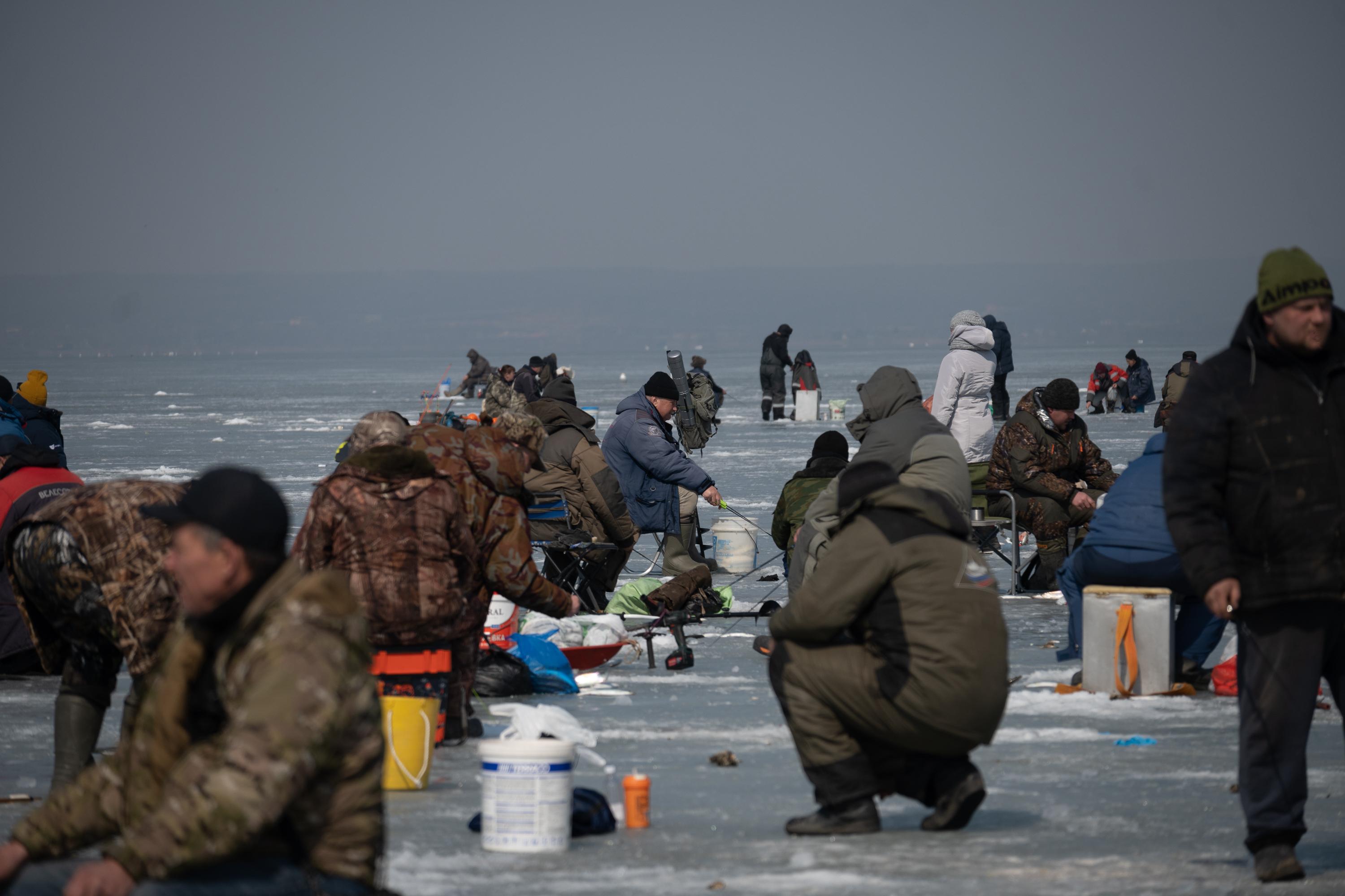 По словам собеседника, людей действительно много: автомобили выехали на лед, где рыбаки расположились семьями или компаниями, а некоторые в одиночку разбрелись по всей площади. Лед выглядит крепким и безопасным, его толщина очевидна при рубке лунок.